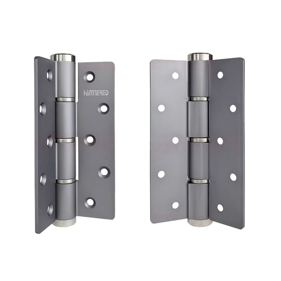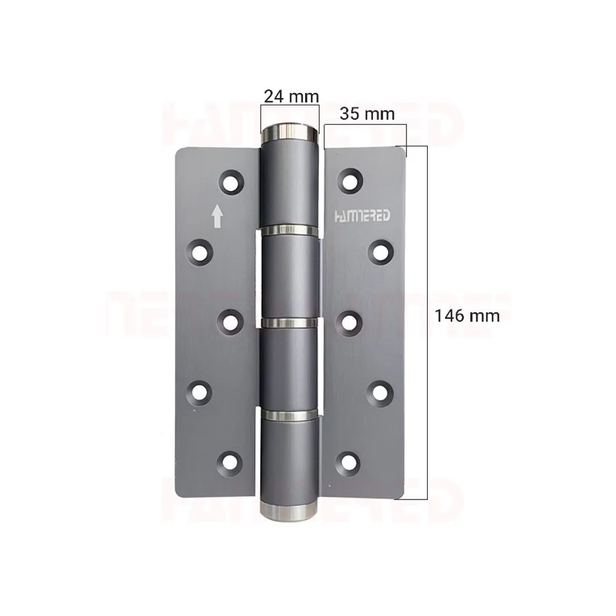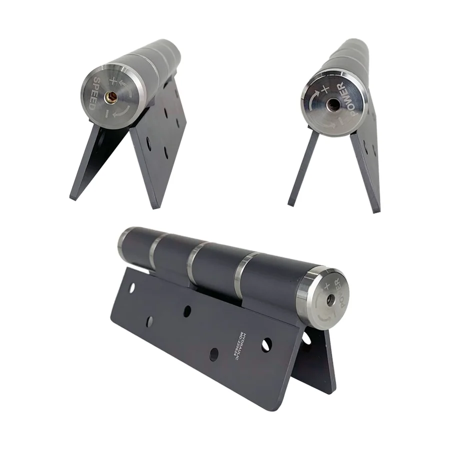 Đây là bộ 3 cái bản lề trong đó gồm 1 bản lề thủy lực tự đóng mở và 2 bản lề chịu tải sử dụng cho cửa nặng 50kg. Bản lề chỉ dừng ở góc 90° và tự đóng ở các góc độ khác, góc mở của bản lề tối đa là 160°. Đối với cửa nặng hơn cần tăng thêm số lượng bản lề chịu tải.