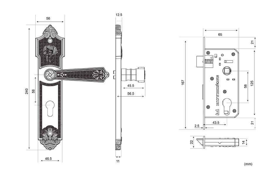 • Tay ốp khóa sản xuất bằng vật liệu đồng vàng (đồng thau).