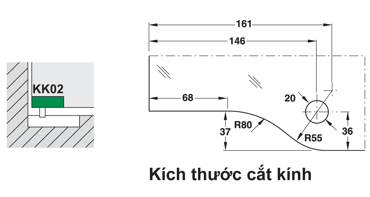 - Sản phẩm kẹp kính dưới KK02 nằm trong bộ kẹp kính Huy Hoàng, sản phẩm được dùng kết hợp với bản lề sàn 01 hoặc 02.