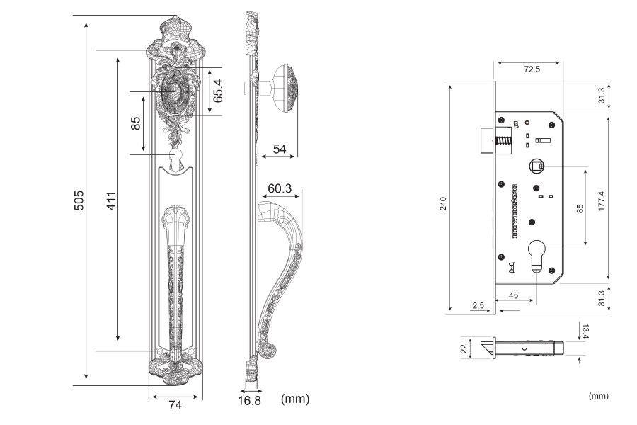- Tay ốp khóa sản xuất bằng vật liệu đồng vàng (đồng thau).
