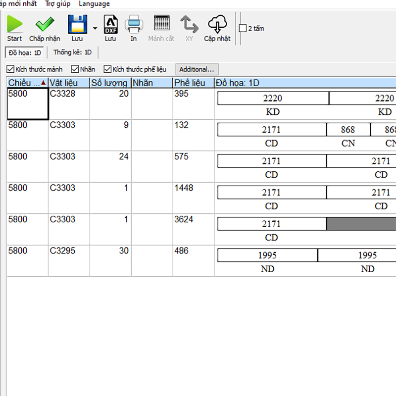 • Nút thông kê 1D: Là nơi thể hiển thị các bảng thông kê chi tiết về dữ liệu chia cắt. Như hiển thị % sử dụng, hiển thị số kg nhôm nếu cài đặt như ở bước 1, hiển thị các thông kê khác…