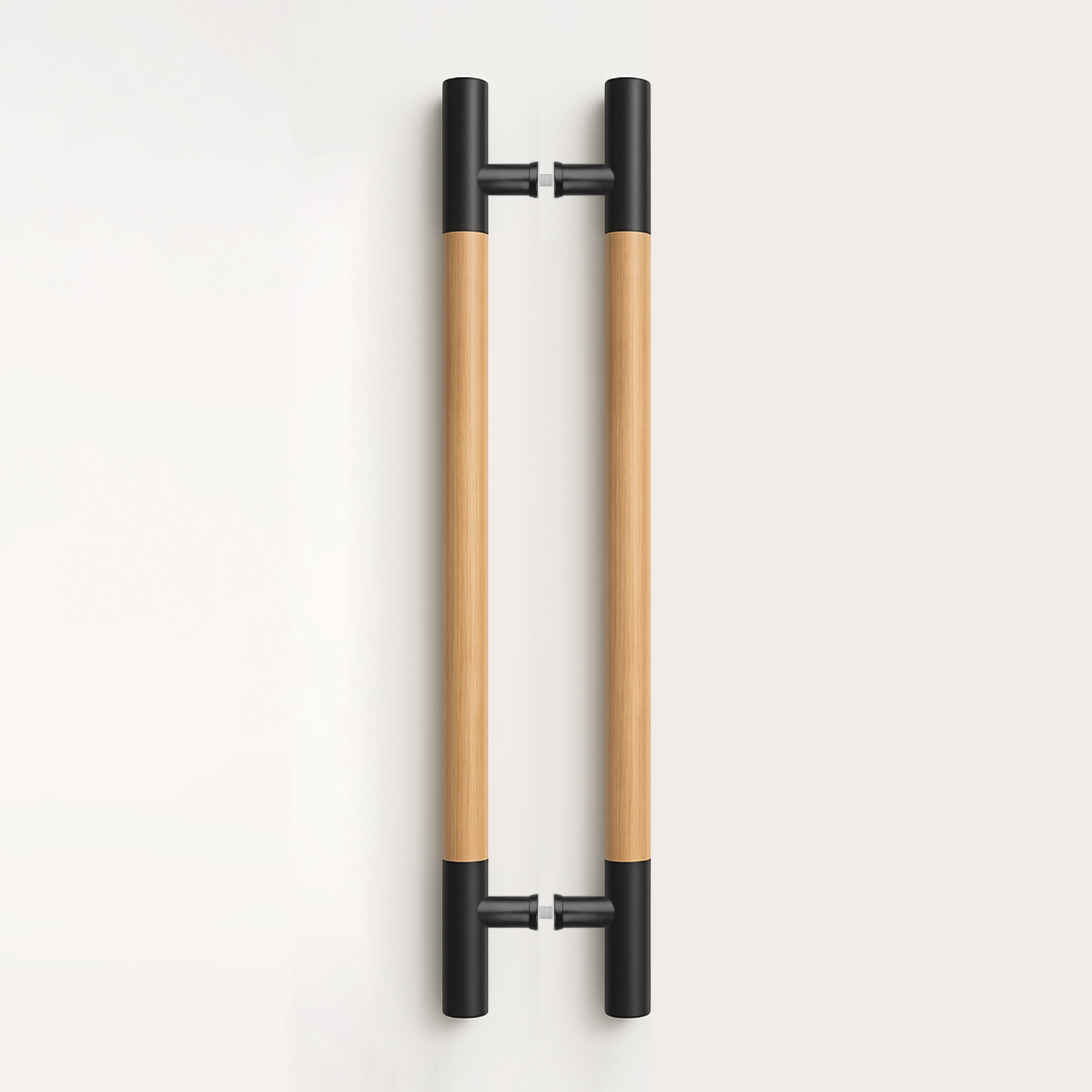 Tay nắm cửa TN114 đầu inox đen mờ, thân gỗ sồi ø38