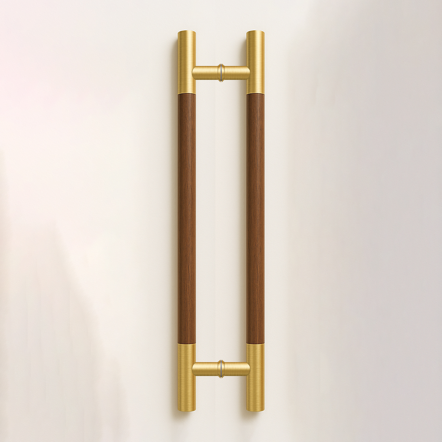 Đầu inox vàng xước mờ, thân gỗ vân gỗ tự nhiên, sơn PU bóng phủ. |