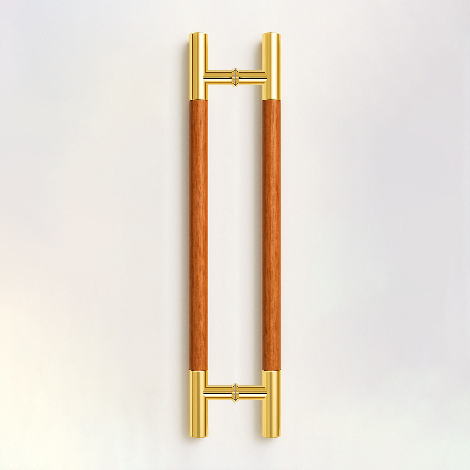 Tay nắm cửa TN120 đầu inox vàng bóng, thân gỗ gõ đỏ ø38